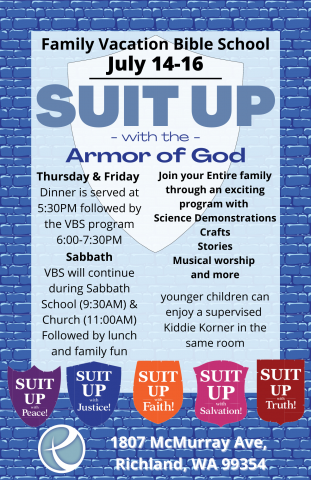 Every summer, the Richland Adventist Church invites Kids in our COMMUNITY who are K-7th Grade to join us in a week packed with fun-filled Bible Adventures and activities, Vacation Bible School at the Richland Adventist Church always includes a variety of songs, games, crafts, recreation, snacks, Bible Stories, Community Service activities, new friends, and lots of FREE FUN for everyone!